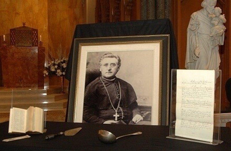 A photograph of Bishop Hendricken is displayed with his breviary, a letter and items of silverware from his episcopate in an exhibit of diocesan heritage in Providence